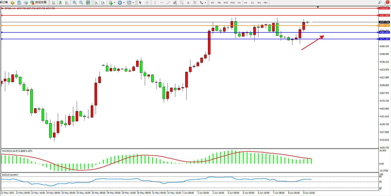 标普SP500——4小时K线图显示: