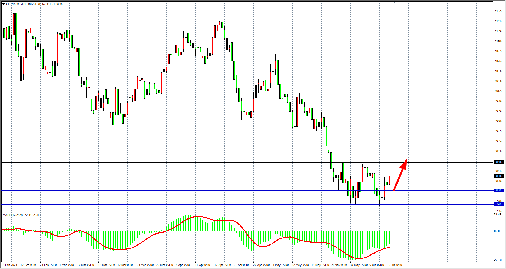 4小时图看,沪深300在3800之上走强,该位支撑有效,MACD量能在零轴下开始缩量,行情短期走强,上方阻力3860-3900,支撑关注3800。