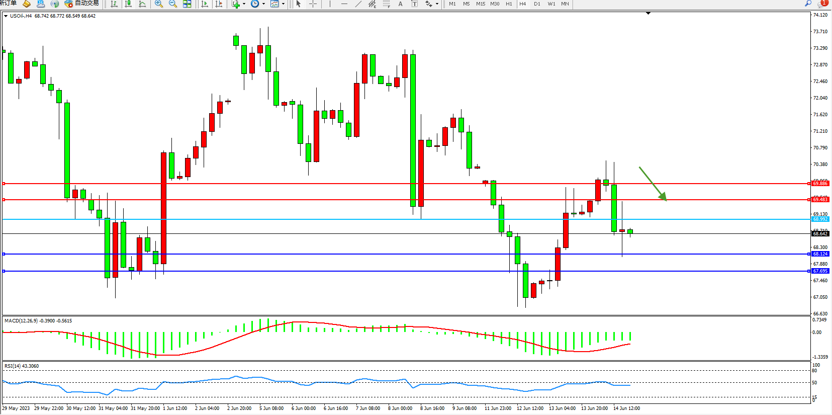 交易策略:68.992下方看跌,目标68.124 67.695