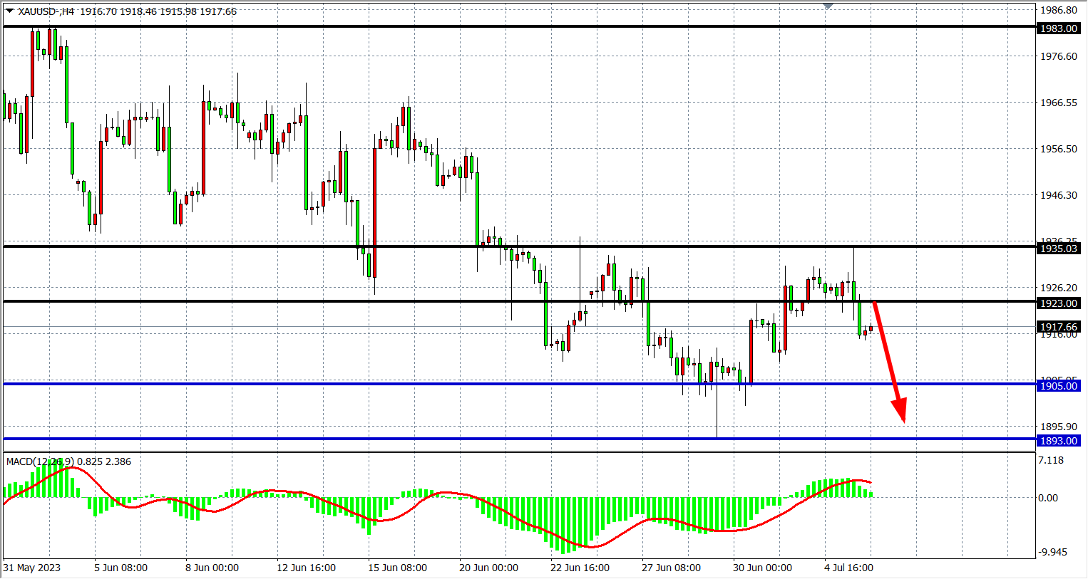 4小时图看,黄金在反弹1935后受压回落,MACD量能在零轴上缩量,趋势开始走弱,阻力关注1923-1935,支撑关注1905-1893。