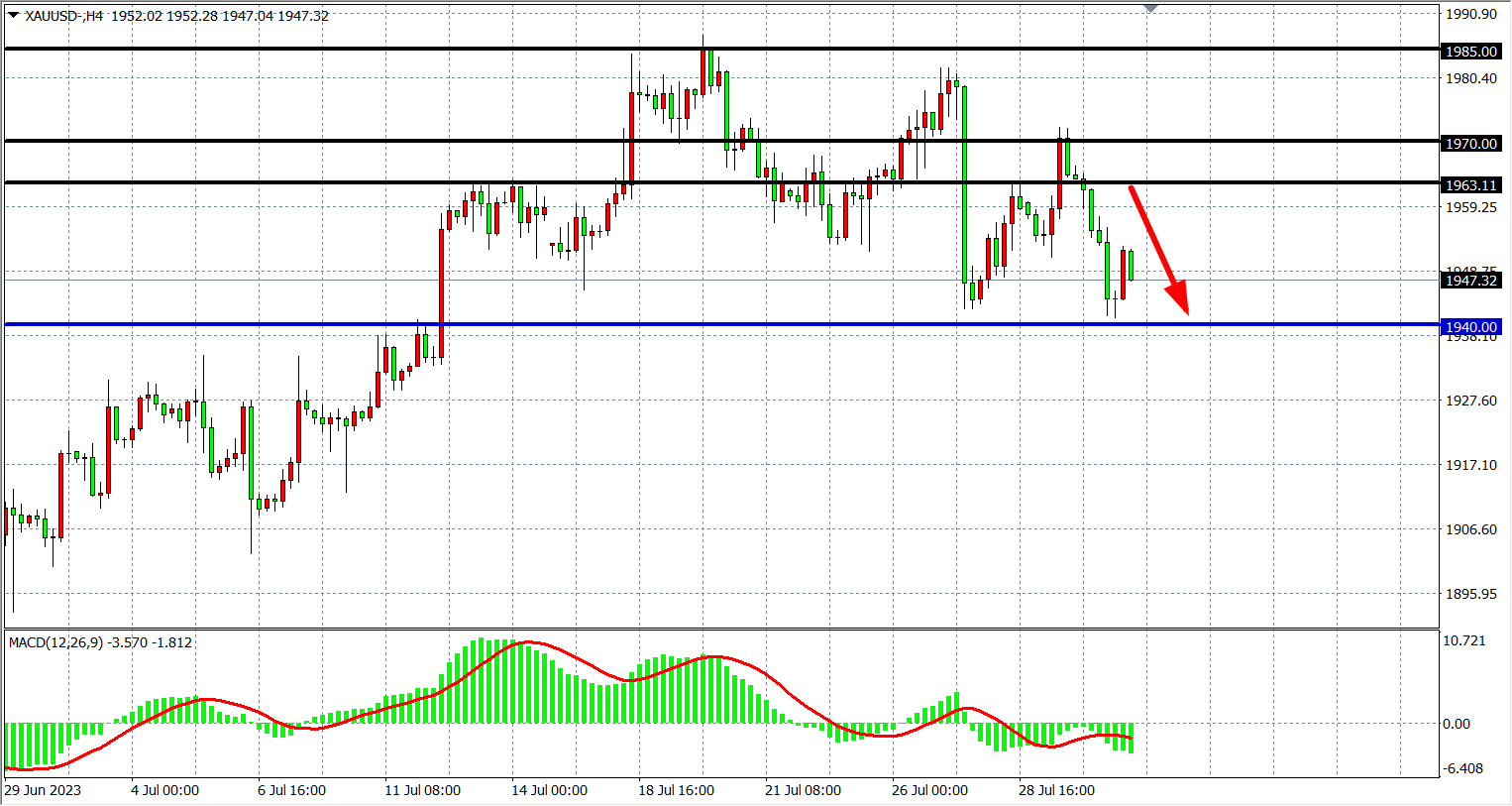 4小时图看,黄金在1970受阻后跌至1940附近,MACD量能在零轴下运行,行情走势偏空头,上方阻力1963-1970,下方支撑看1940附近。