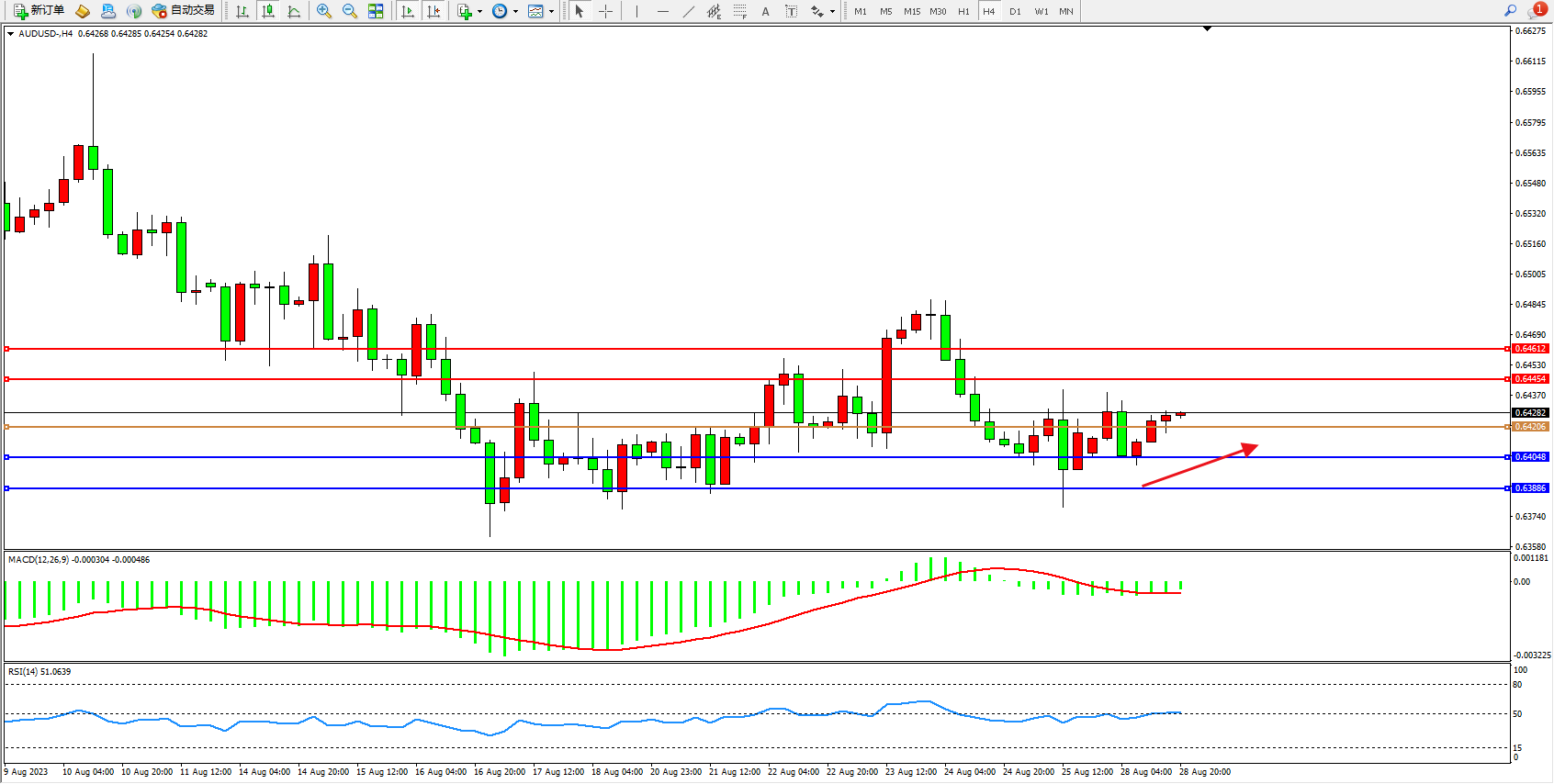 澳元美元AUDUSD——4小时K线图显示: