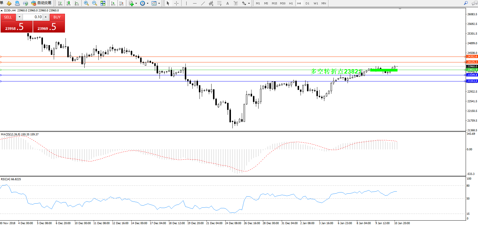 道琼斯指数DJ30—— 4小时K线图显示:
