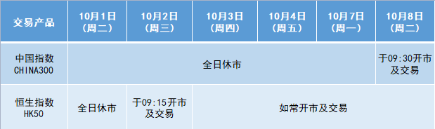 因应2024年10月1日至10月7日期间为国庆节假期,本公司以下产品的交易时间将于假期期间作以下安排,敬请留意。