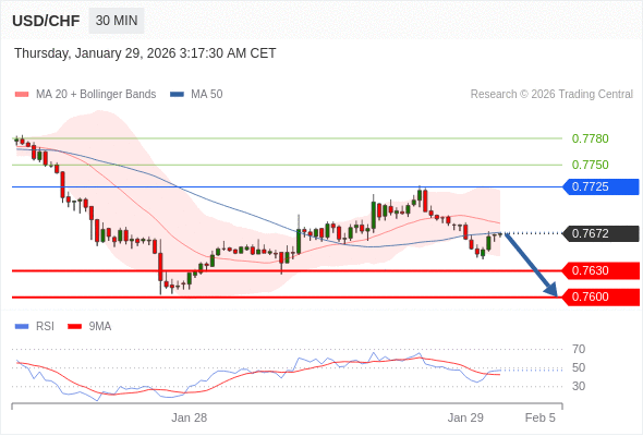 美元/瑞郎 当日内: 短期关键阻力位在0.7725。