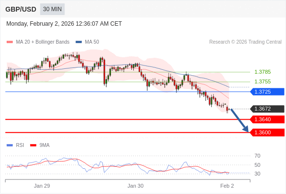 交易策略: 在 1.3725 之下,看跌,目标价位为 1.3640 ,然后为 1.3600 。