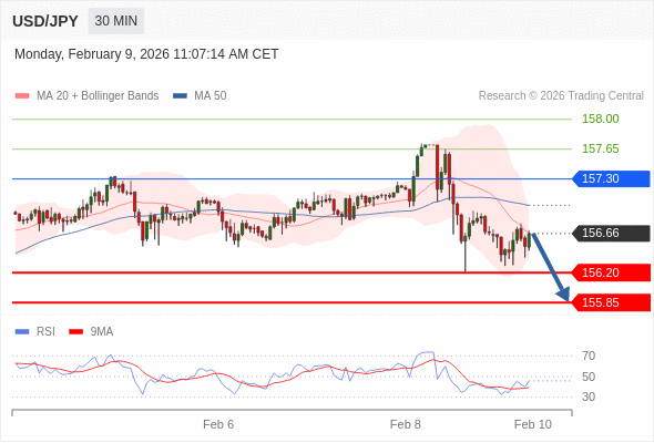 在 157.30 之下,看跌,目标价位为 156.20 ,然后为 155.85 。