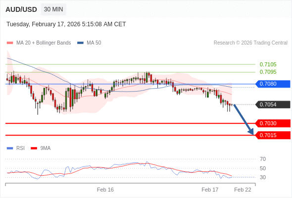 交易策略: 在 0.7080 之下,看跌,目标价位为 0.7030 ,然后为 0.7015 。