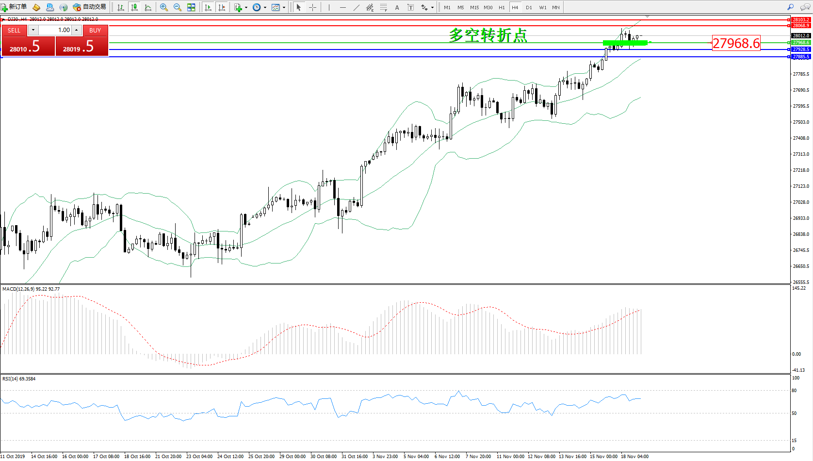 道琼斯指数DJ30—— 4小时K线图显示: