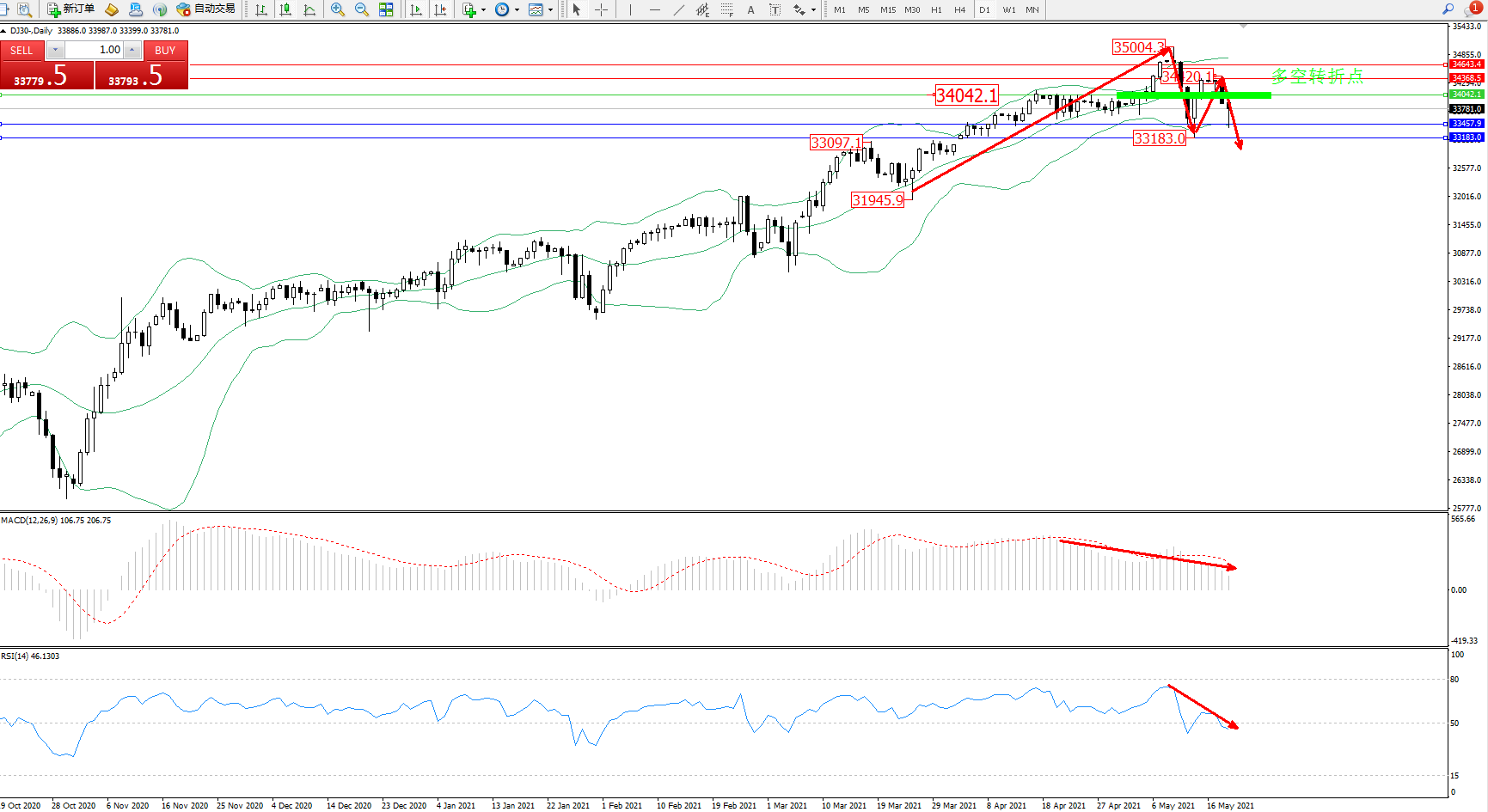 交易策略:34042下方看跌,目标33457、33183
