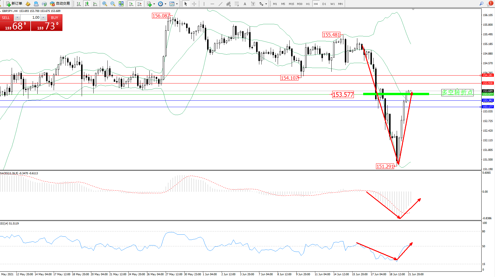 技术点评:空头动力延续布林带指标下轨附近持续震荡下行,低位抵达151.291位置节点后得到支撑反转向上拉升,强势回升至布林带指标中轨附近节点,且突破中轨进入中上轨区间震荡中,多头动力短期或维持在中轨附近徘徊,布林带指标呈张口走势后开始收口,MACD指标处于0轴线下方空头区域持续震荡下行后反转回升上扬,RSI指标处于空头区域低位得到支撑上扬至50均衡线附近徘徊中;