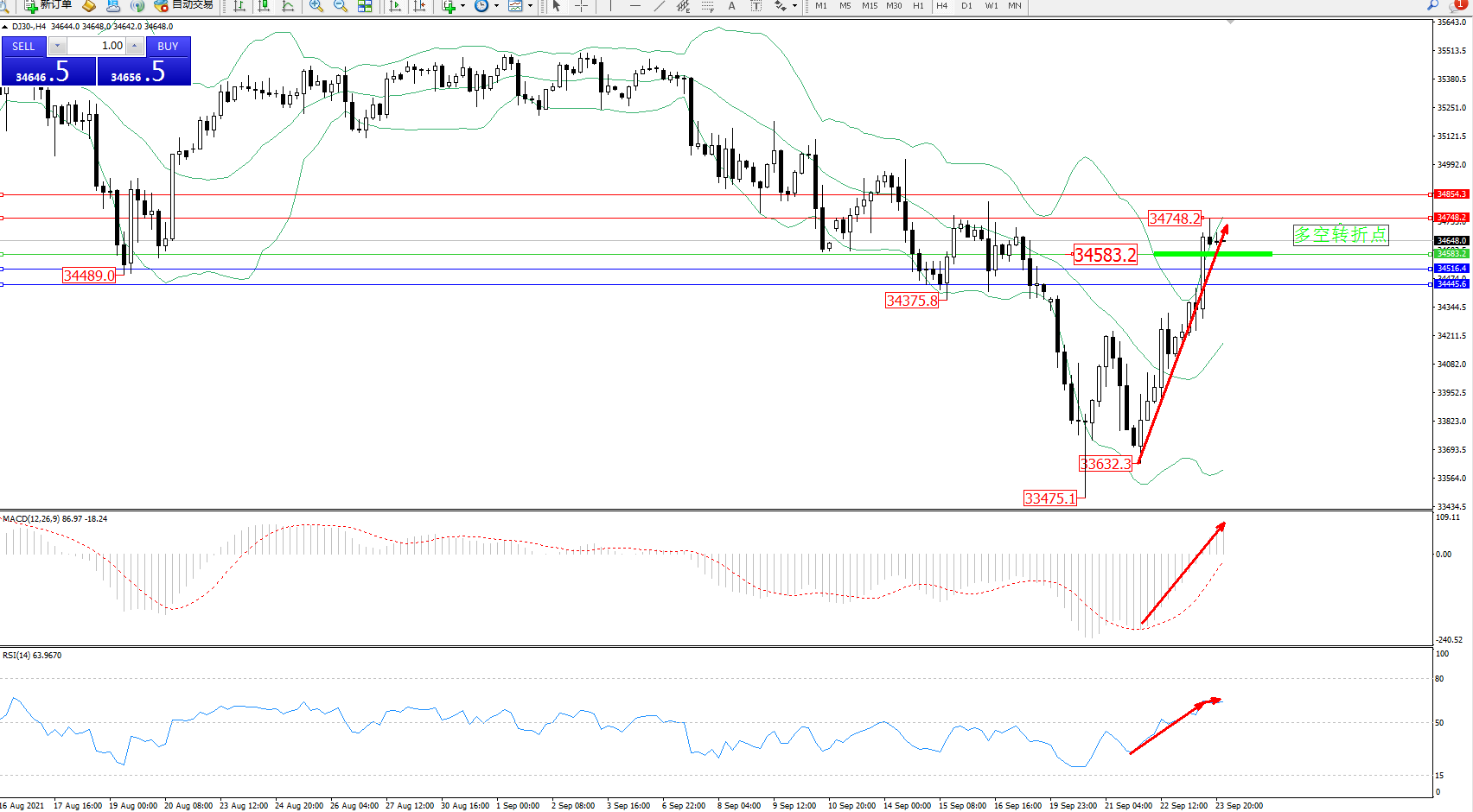 交易策略:34583上方看涨,目标34748、34854