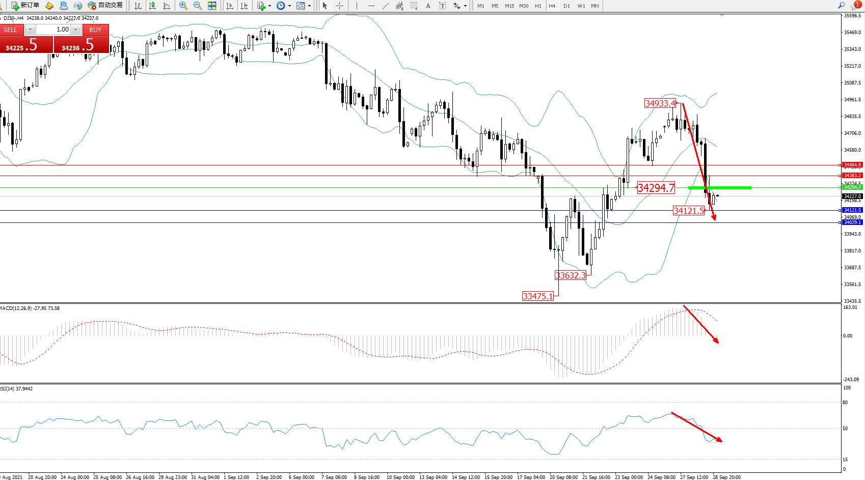 交易策略:34294下方看跌,目标34121、34029