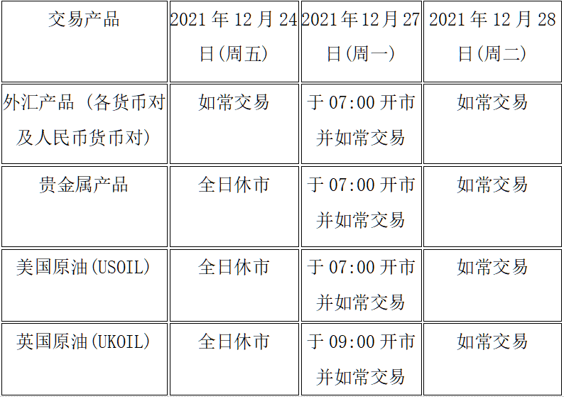 由于各地市场圣诞节假期影响,本公司以下产品的交易时间将于2021年12月24日(周五)至12月29日(周三)作出如下安排,敬请留意。