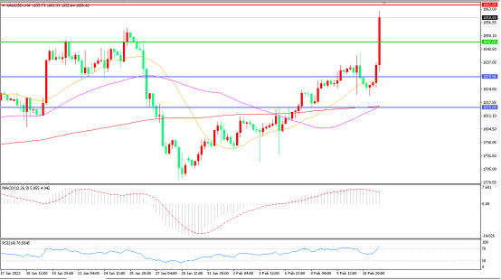 此前,美国总统拜登警告在乌美国人立刻离开,称乌克兰“情况可能很快变得疯狂”,当美俄开始交火时,将会是世界大战”。 现货黄金涨幅一度超过2%,站上1860美元/盎司,黄金作为“避险”资产,随着乌克兰危机一触即发,有望震荡走高。