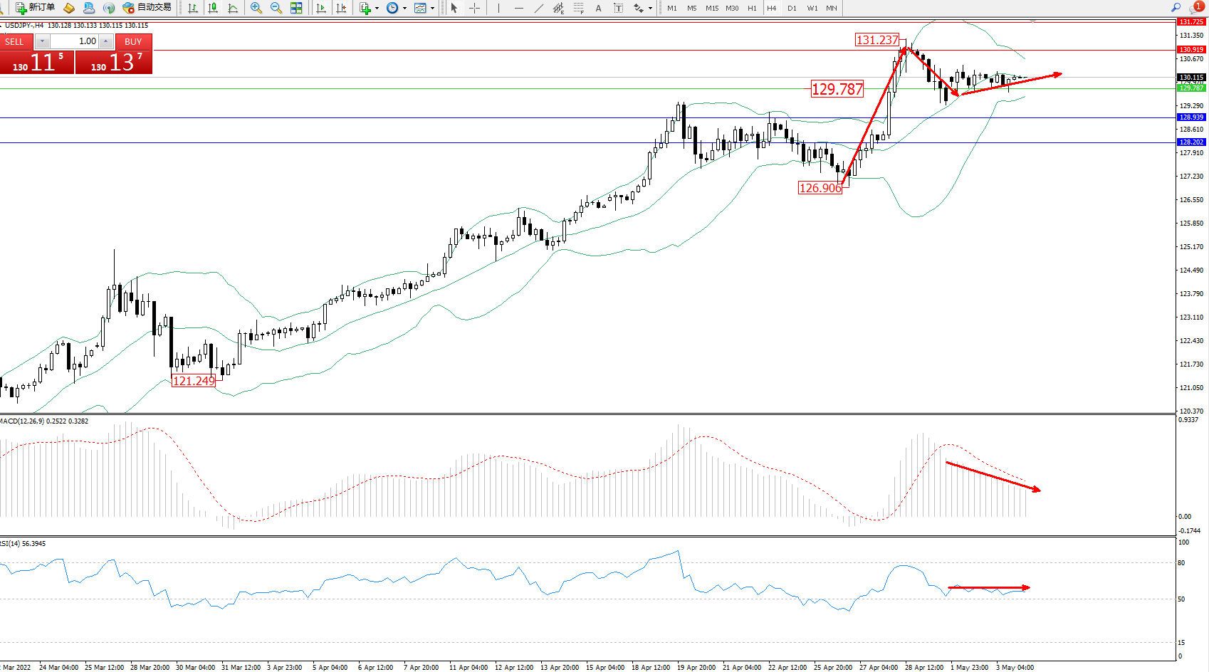 交易策略:129.787上方看涨,目标130.919、131.725