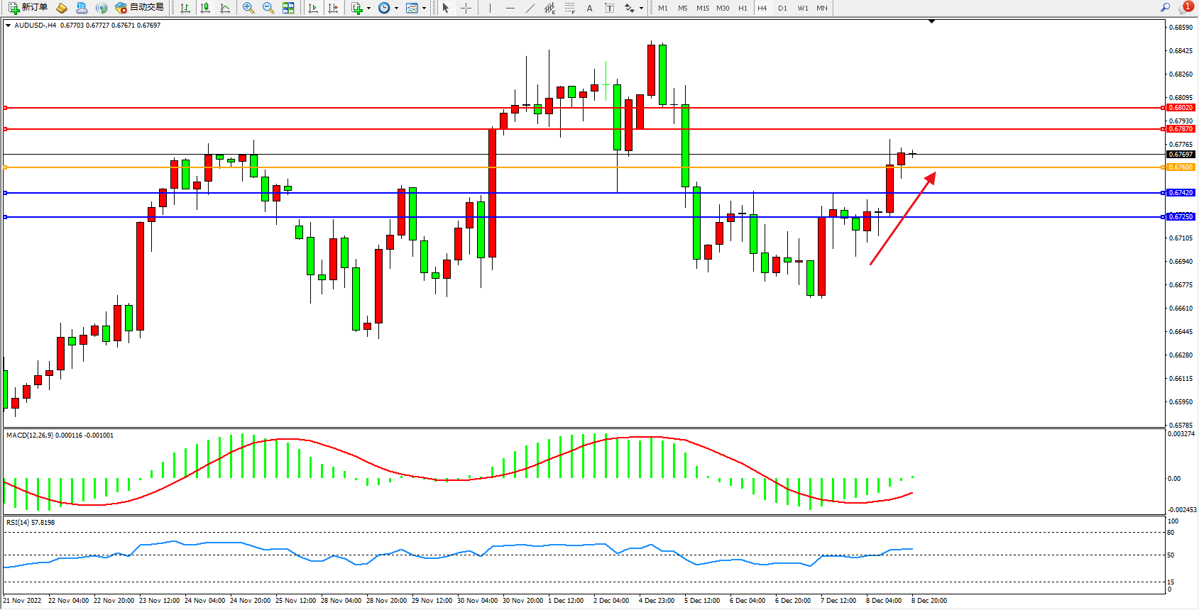 交易策略:0.67600上方看涨,目标0.67870、0.68020